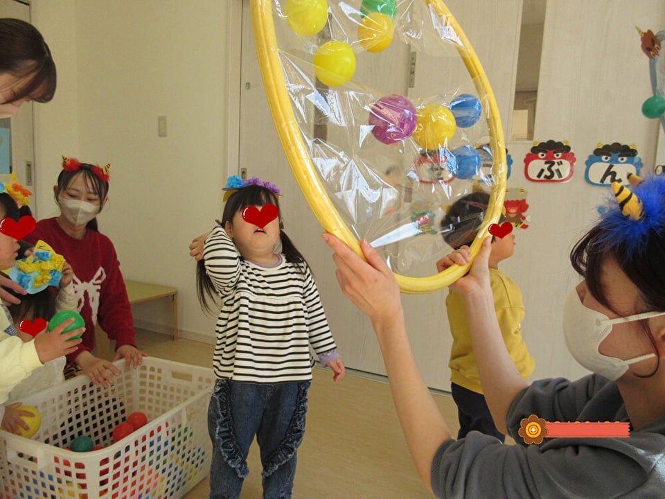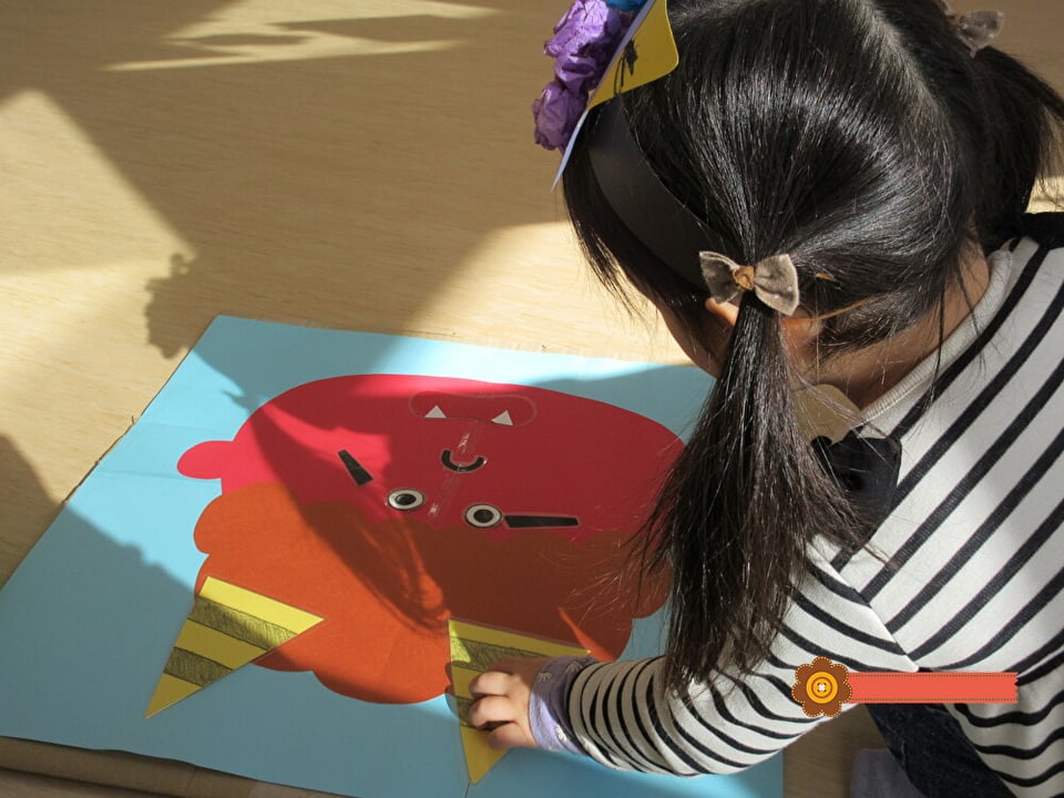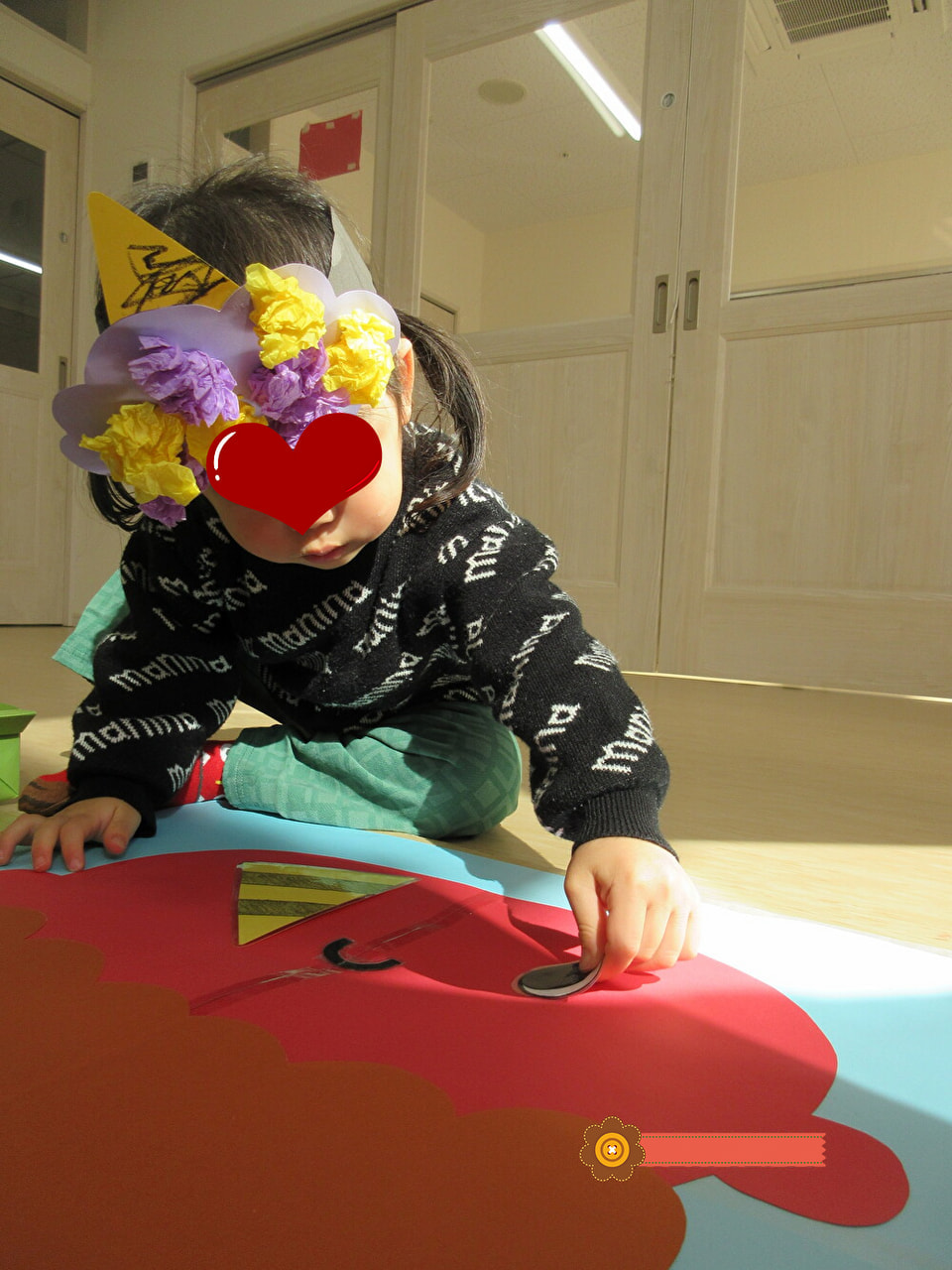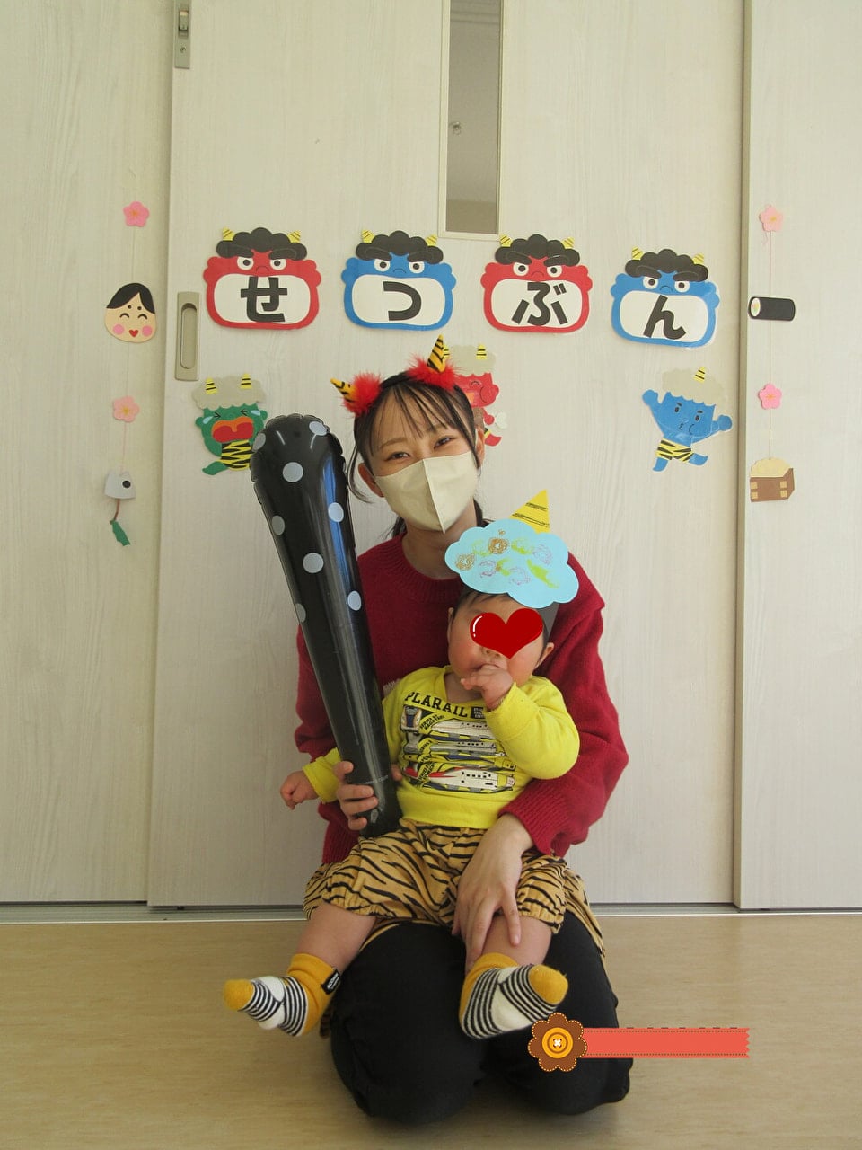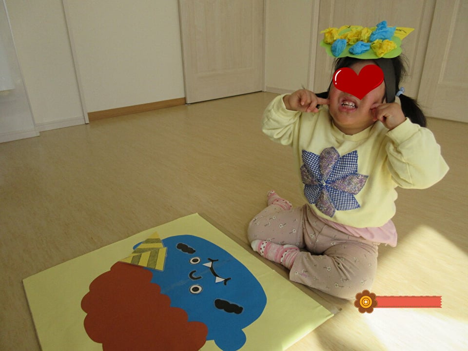 乳児院のみんなは自分で作ったお面をかぶって鬼に変身!