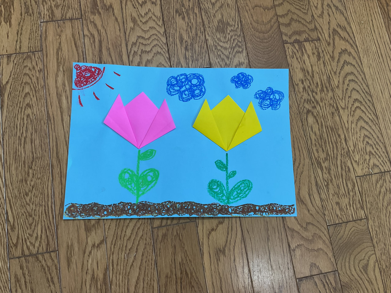 折ったちゅうりっぷをのりで貼って最後に周りにクレヨンで絵を描いて完成させました。