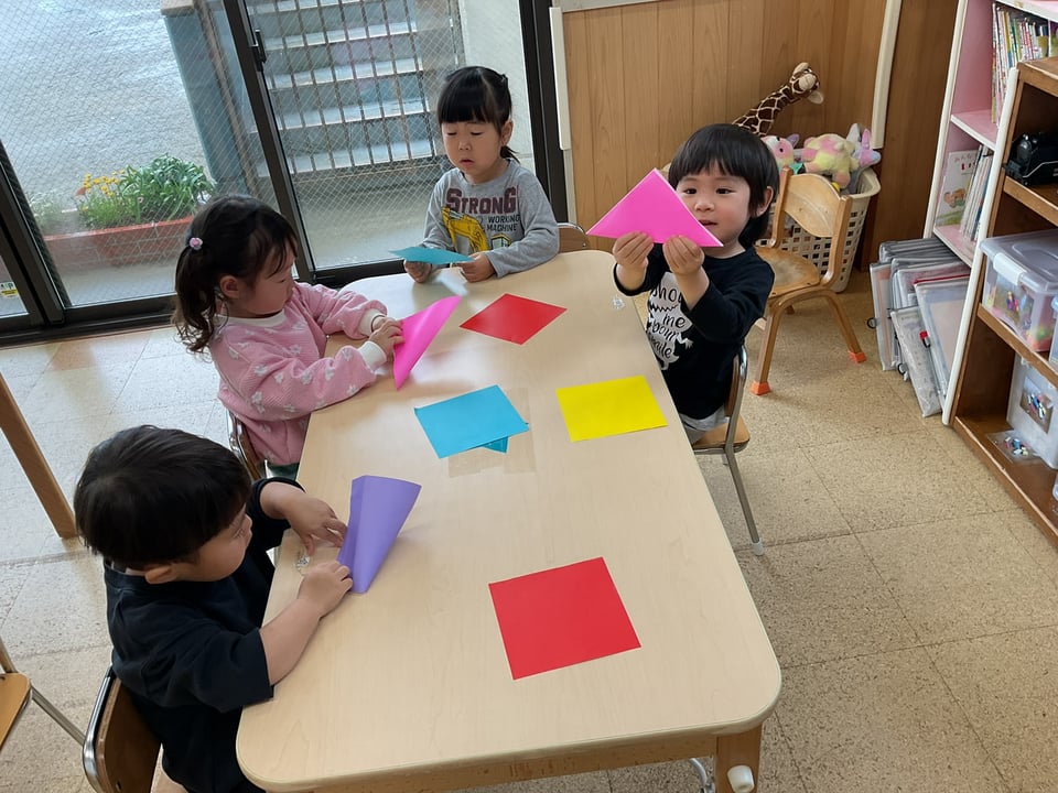 はじめは難しそうにしていても手を添えながら折り方を知らせていくと2枚目は自分で頑張ってみようとしてました。