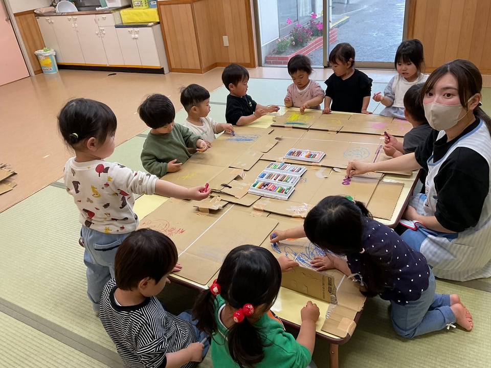 たんぽぽさん(2歳児)は段ボールにクレヨンでお絵描き
