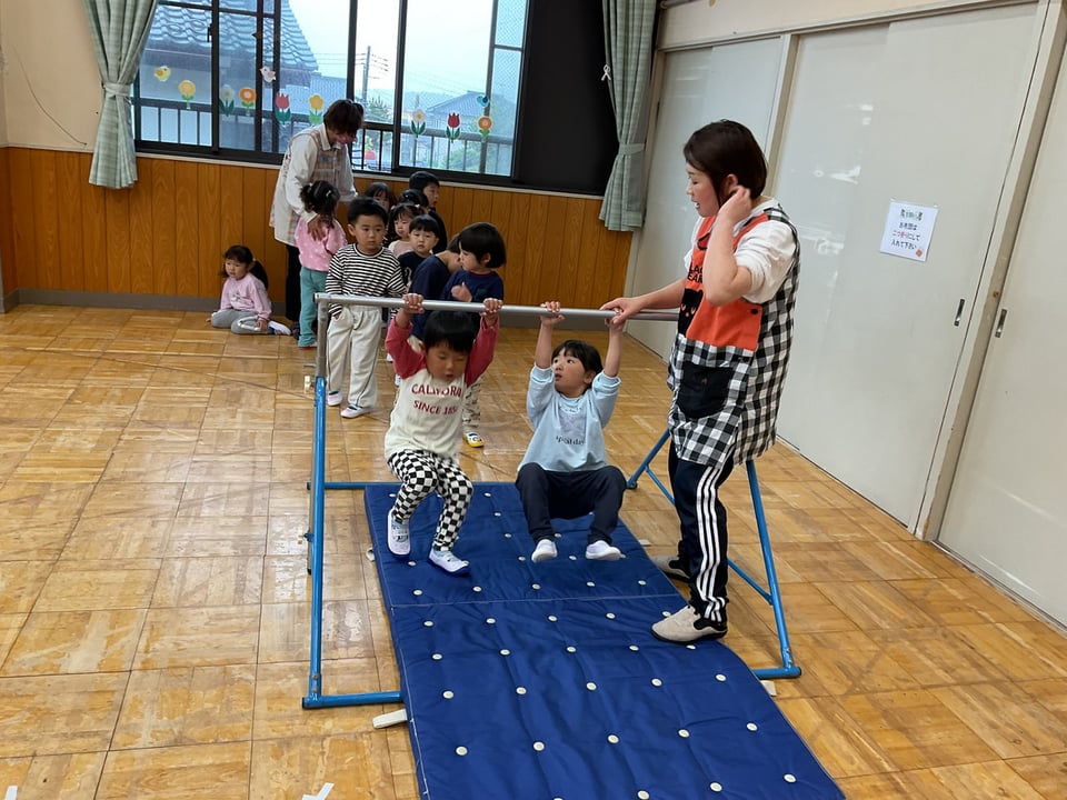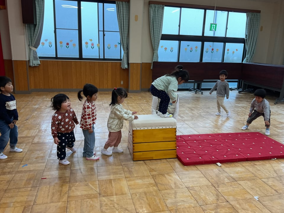 すみれさん(3歳児)はハサミの✂の練習の後二階のホールで体育遊びを行いました。
