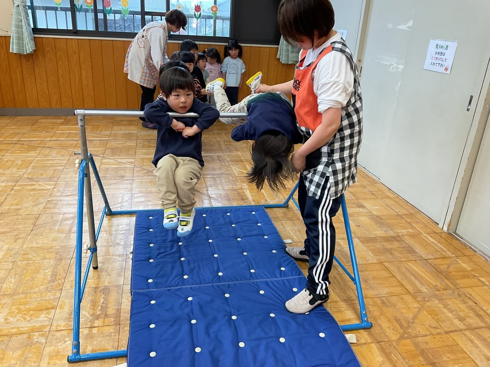 跳び箱を跳んだり鉄棒で前回りに挑戦です。