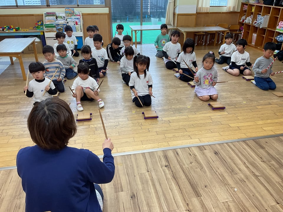 ひまわりさん(5歳児)は、鼓笛隊に向けてバチの練習をしてます。
