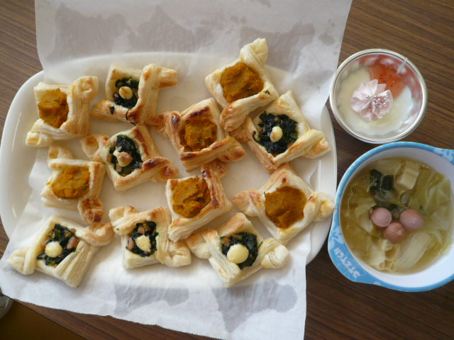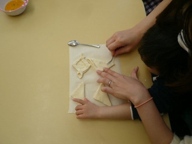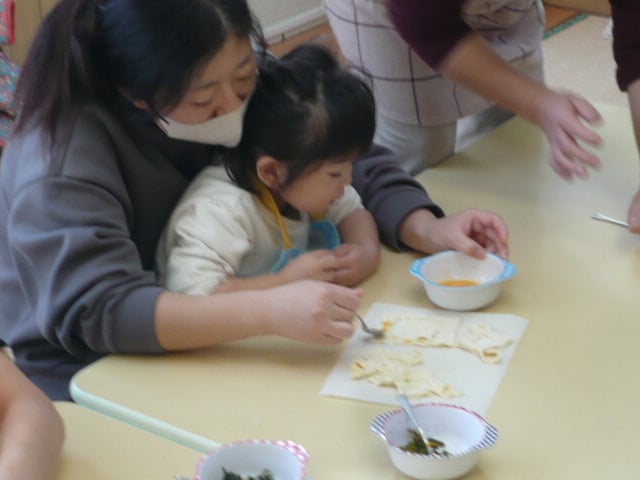 まずはパイ、ママと一緒にパイ生地をのばして型作り(*^_^*)