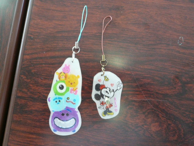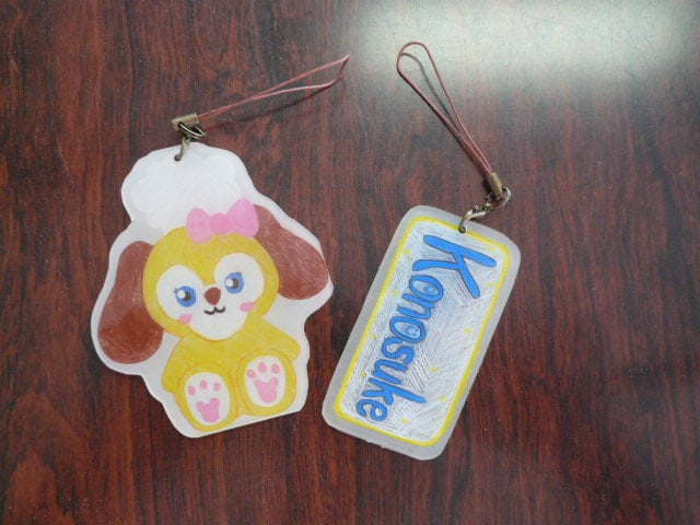 パンチで穴を開けて、オーブントースターで焼いて、ストラップをつけたら完成✨