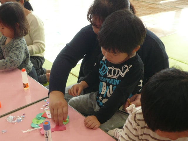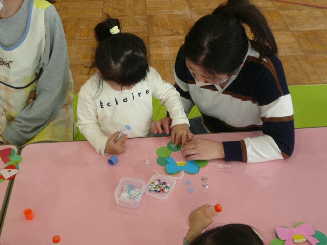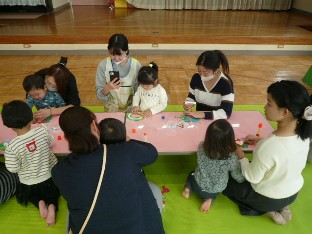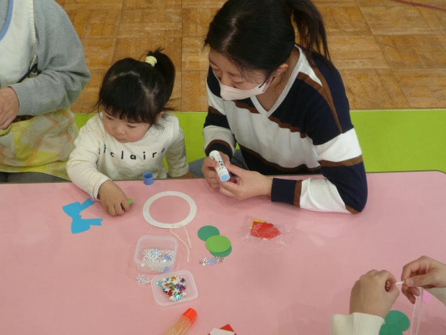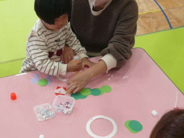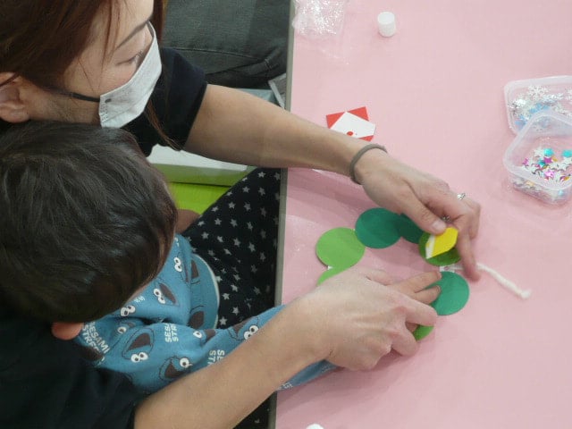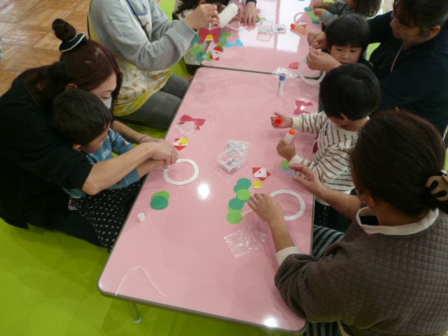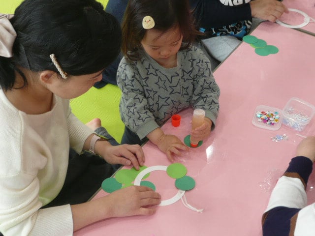 ママと一緒に、枠に緑や黄緑の丸い色画用紙を貼ってリースの形を作ります。![]()