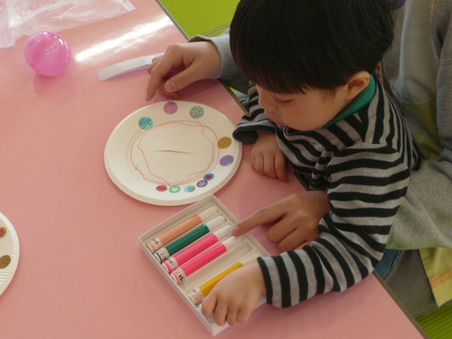 紙皿にシールを貼ったり、ペンで模様を描いたりして…