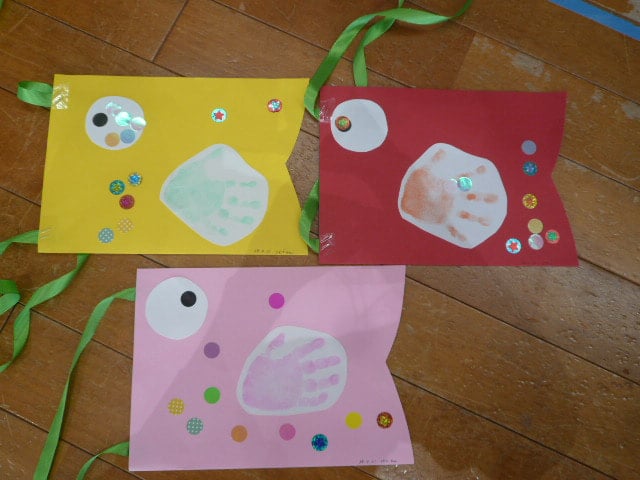 お友だちの手型を使ったこいのぼりなので、来た順に手型をとってもらいました。
