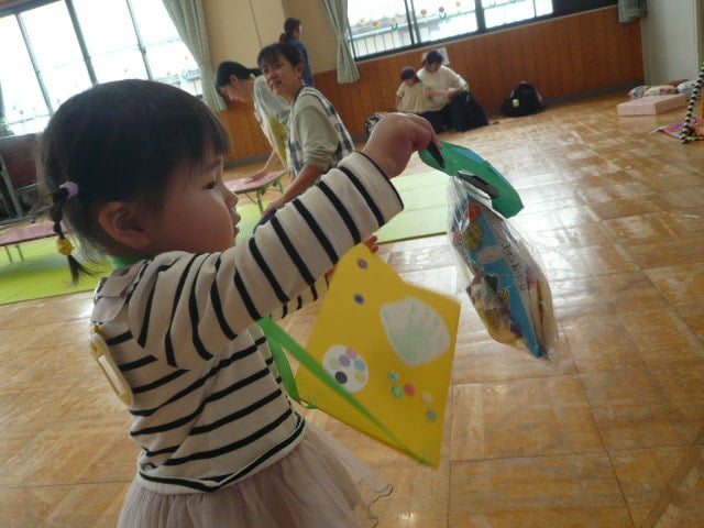 ちびっこ広場では、認定こども園同仁東保育園の2歳・たんぽぽ組のお友だちと一緒に過ごしながら、こいのぼり作りと給食体験を行いました。